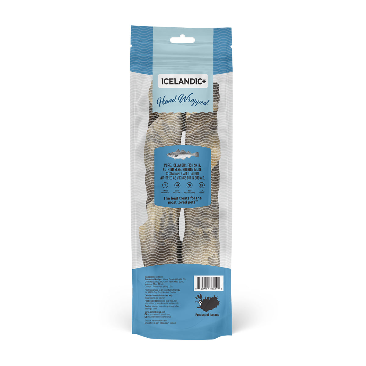 For freshness and convenience, our fish treats are packaged in a resealable bag. Each package contains approximately net wt. 4.6 oz. of Icelandic+ Cod Skin Chew Sticks (Two individual 10" treats).