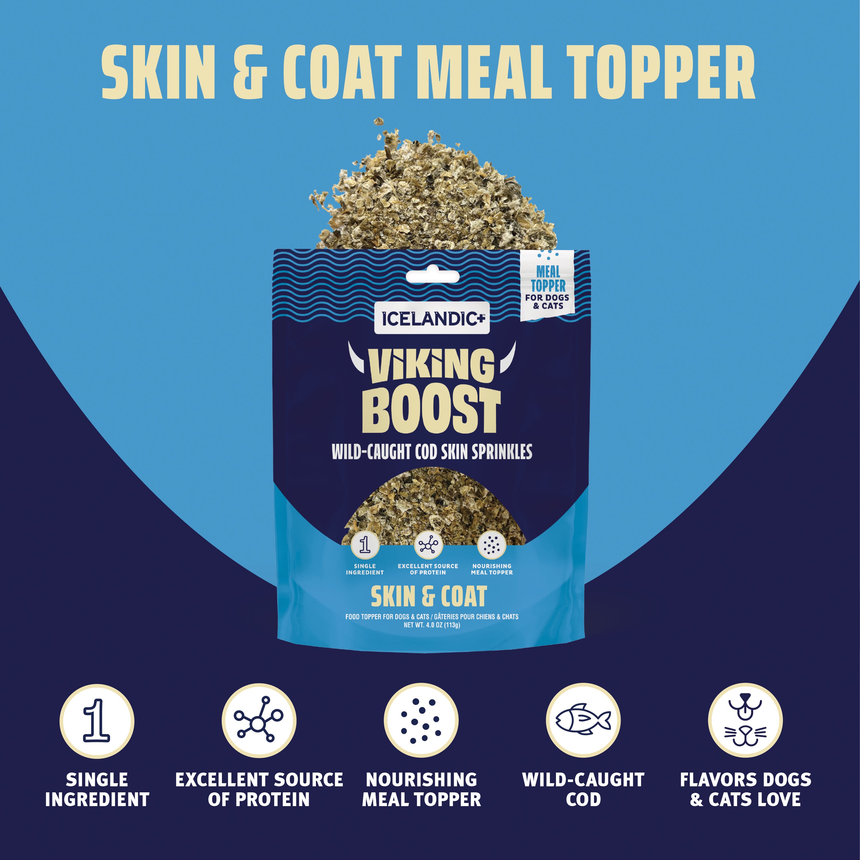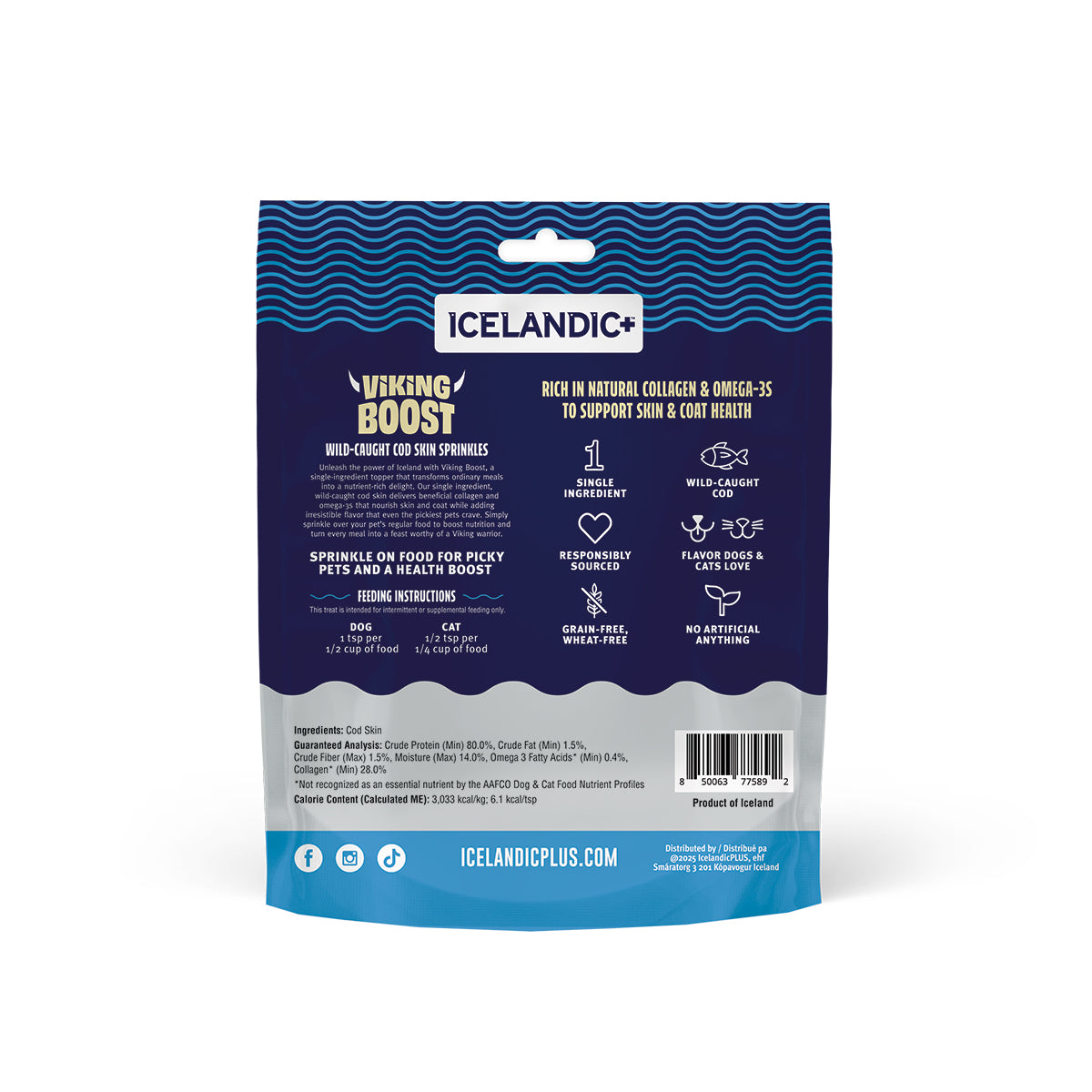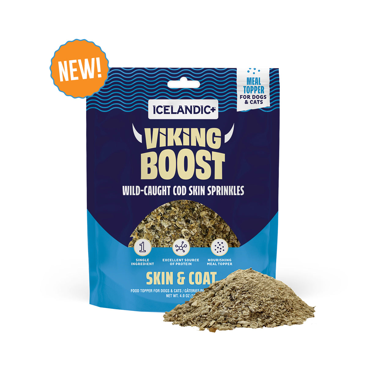 Give your pet a healthy boost made from 100% wild-caught Icelandic cod skin. These single-ingredient sprinkles are a simple, powerful way to upgrade your pet’s daily meals. Rich in naturally occurring omega-3 fatty acids, Viking Boost Cod Skin Sprinkles help support healthy skin, a shiny coat and overall vitality with zero fillers or additives.